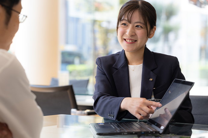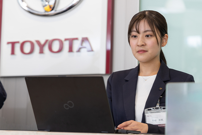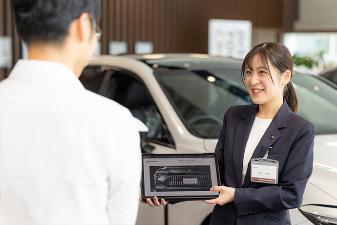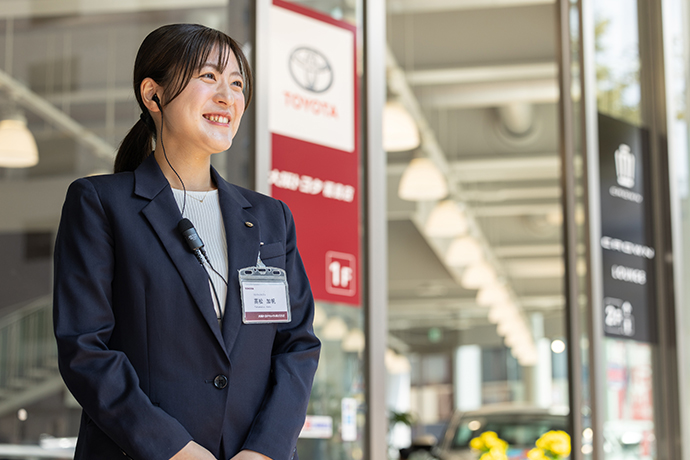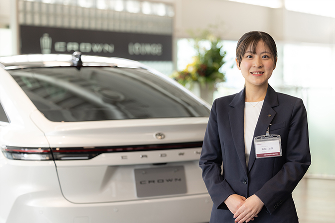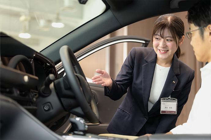 幼い頃、父に連れられてよく自動車ディーラーへ行っていました。店舗に行くとショールームスタッフの方が優しく、私にお菓子をくれたり一緒に遊んでくれたりして、当時子供だった私は「大きくなったら、あの方のようになりたい」と憧れるようになりました。この幼少期からの憧れと、人と話すことが好きで接客業に就きたいという思いから、自動車ディーラーへの就職を決めました。