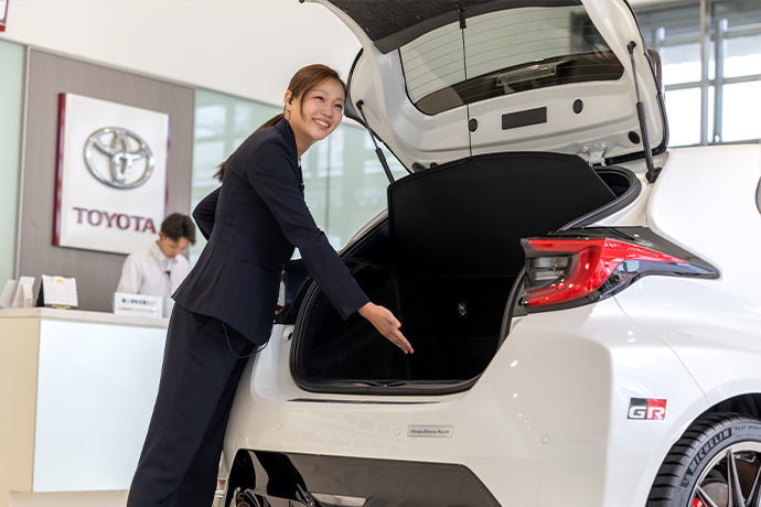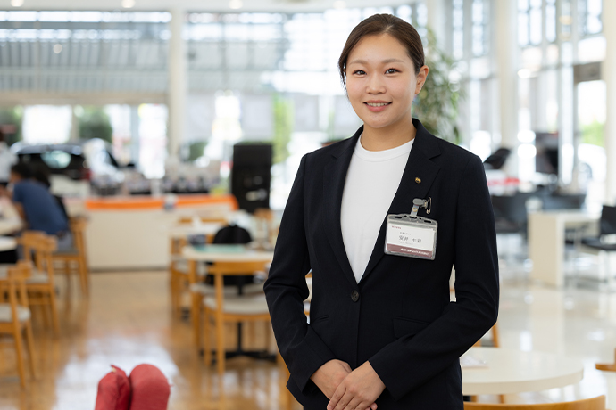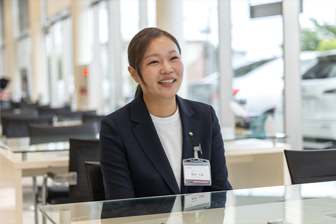 ただ、お客様にうまくクルマのご説明ができないこともありました。その際、先輩に相談すると「みんな同じスタートだから大丈夫」と話してくださり、その言葉に救われ、先輩の商談に同席をして学び、自分でも勉強を重ねるうちに、少しずつ自信を持って説明することができています。